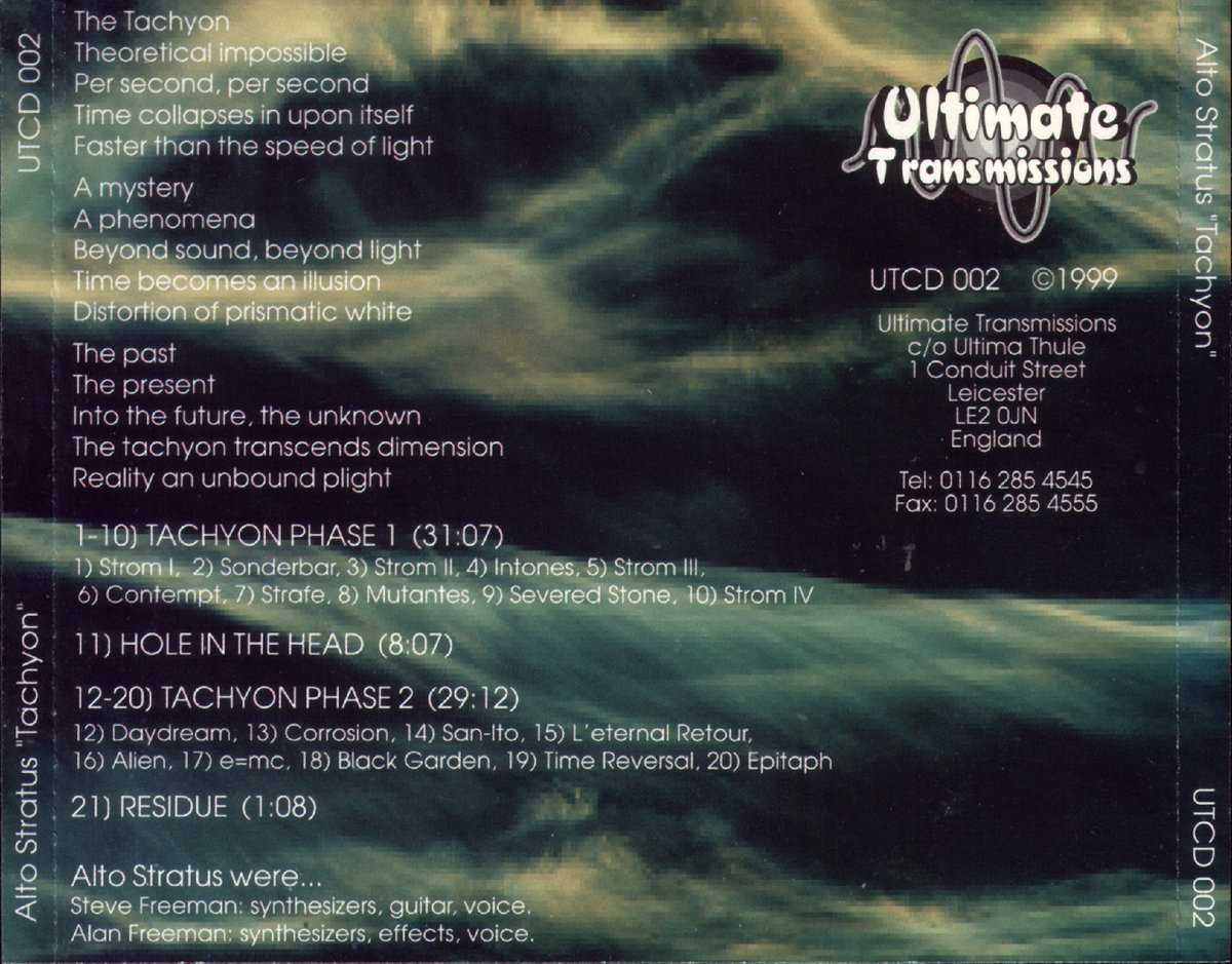 The duo of Alan and Steve Freeman (Ultima Thule), we spent much of our spare time during the 1980's experimenting with electronics, sound collage, etc., recording some 30 odd cassettes as Alto Stratus (and other guises: Vrije, Q.S.O., Electric Junk, etc.), also as soloists, and the trio ZBB. For 30 years we've continued with a 10 further releases since, bands: Endgame, The Newt Hounds, Triax, etc. ... more