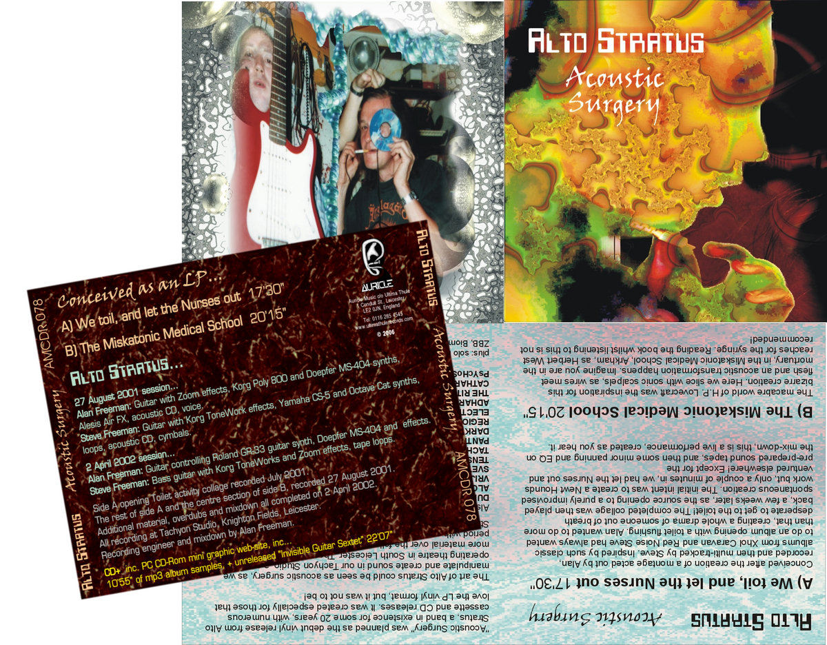 The duo of Alan and Steve Freeman (Ultima Thule), we spent much of our spare time during the 1980's experimenting with electronics, sound collage, etc., recording some 30 odd cassettes as Alto Stratus (and other guises: Vrije, Q.S.O., Electric Junk, etc.), also as soloists, and the trio ZBB. For 30 years we've continued with a 10 further releases since, bands: Endgame, The Newt Hounds, Triax, etc. ... more